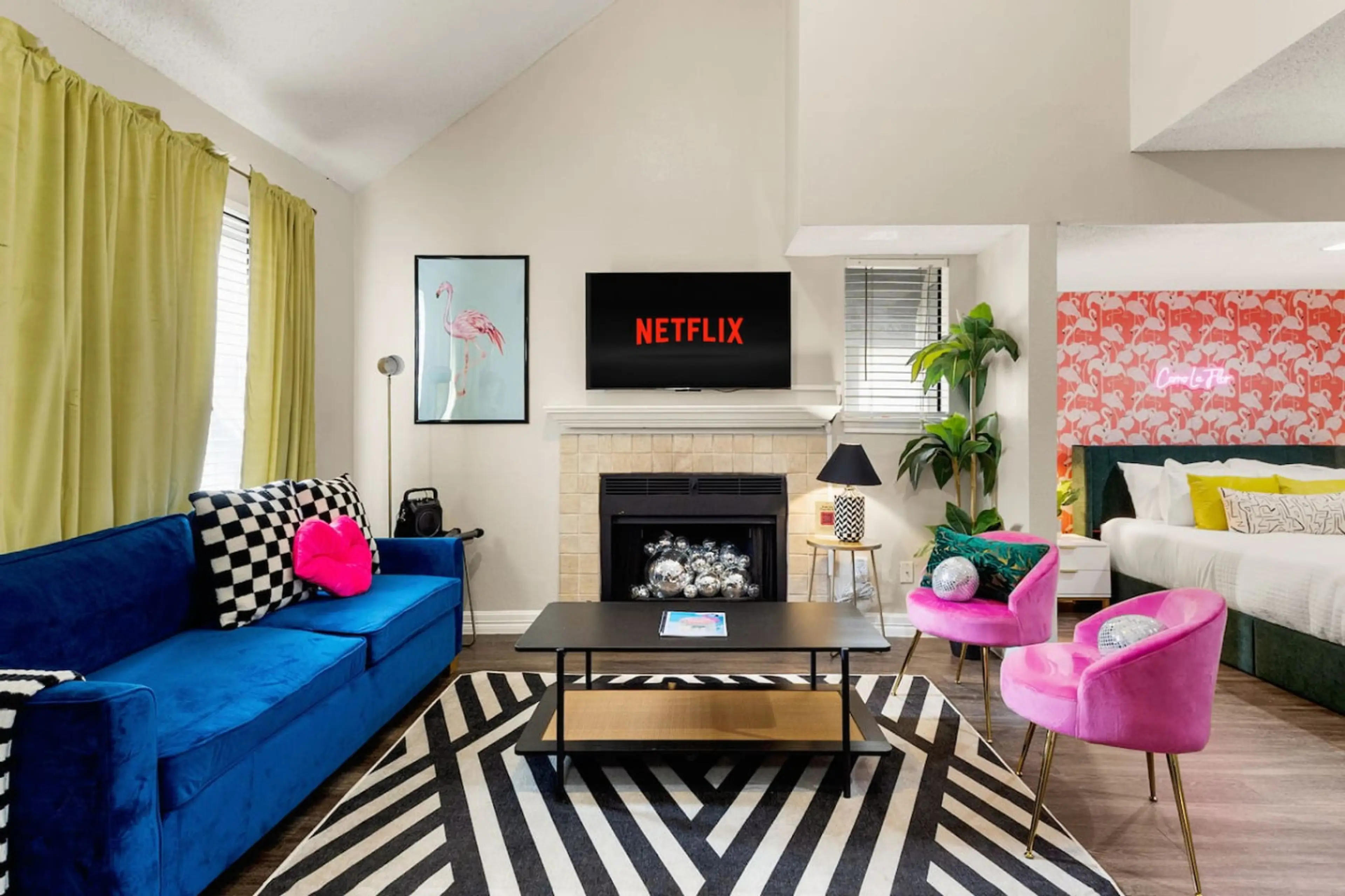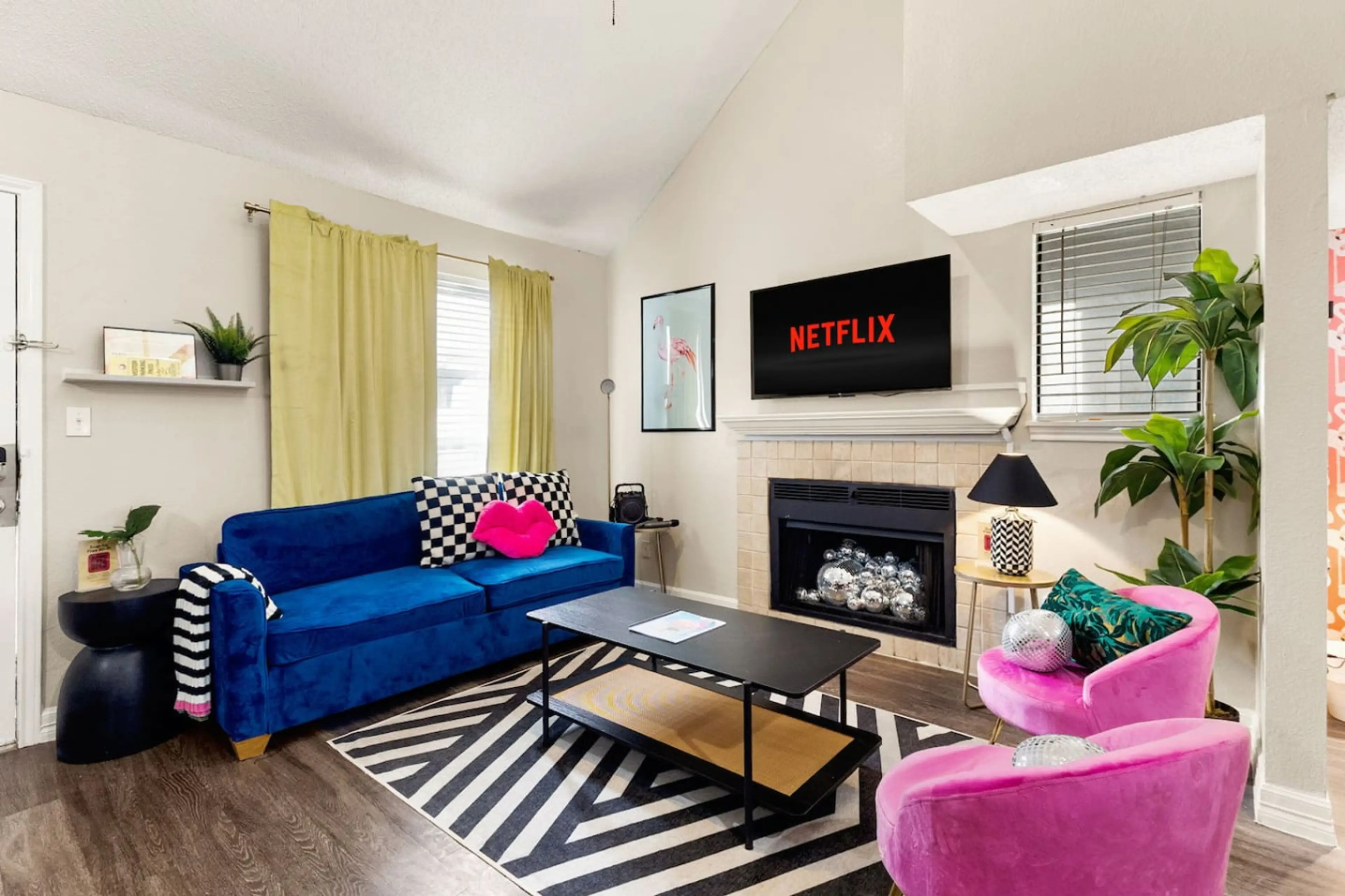 Welcome to Poolside Selena – a stylish 2-bedroom, 2-story home just 15 minutes from the San Antonio River Walk and 8 minutes from the airport. This thoughtfully designed retreat sleeps 6 with two queen beds and a hotel-style queen sofa bed. Enjoy access to a sparkling pool, gym, fast Wi-Fi, smart T...